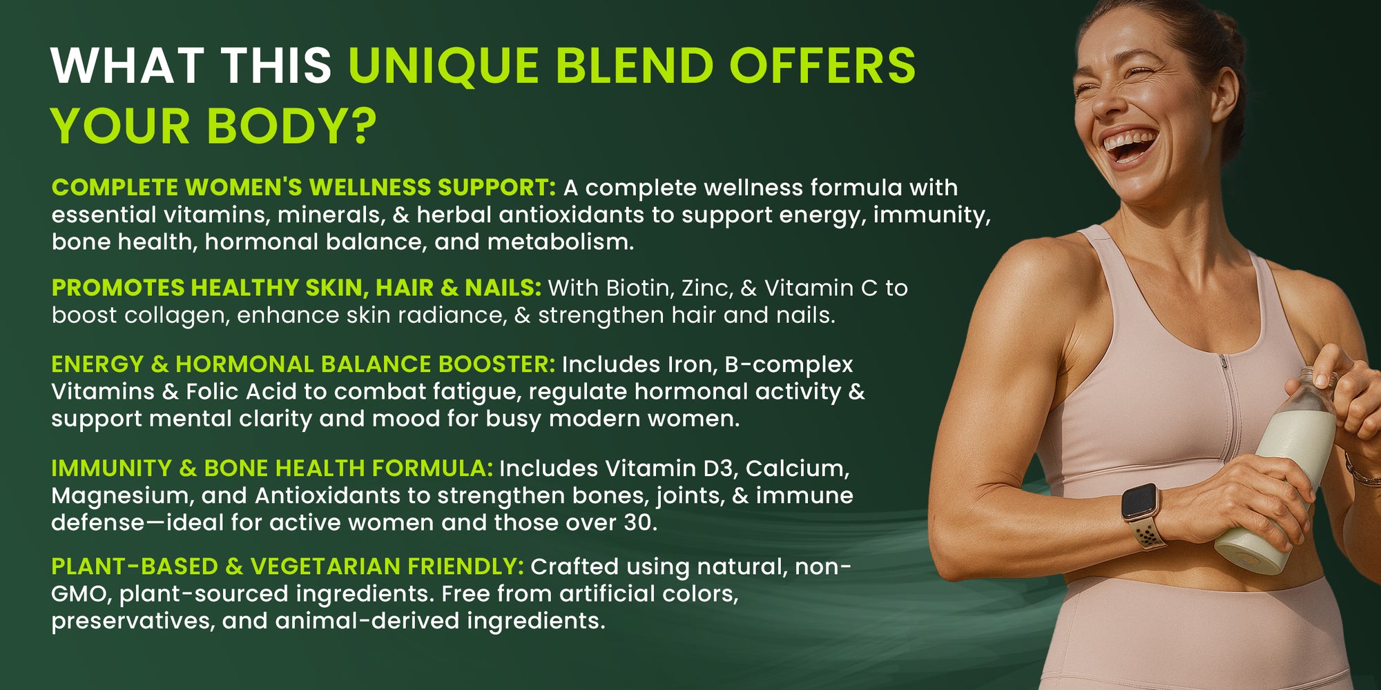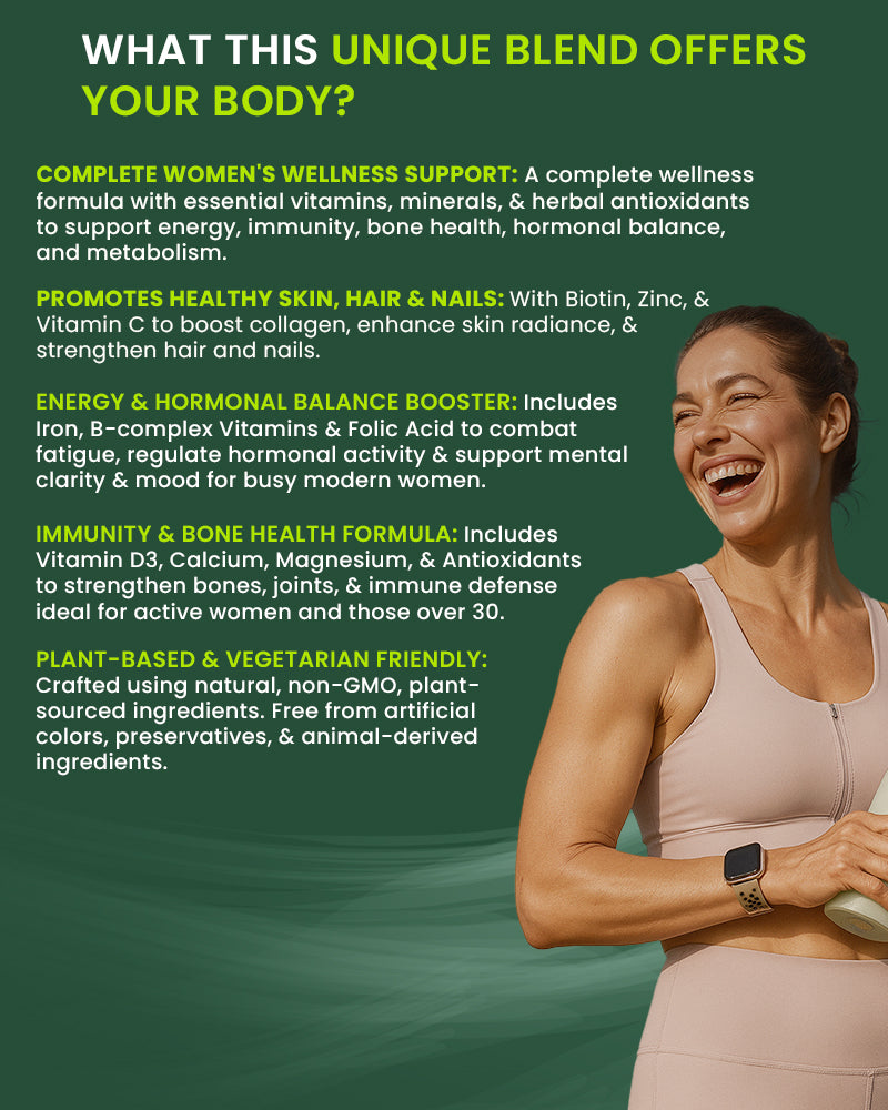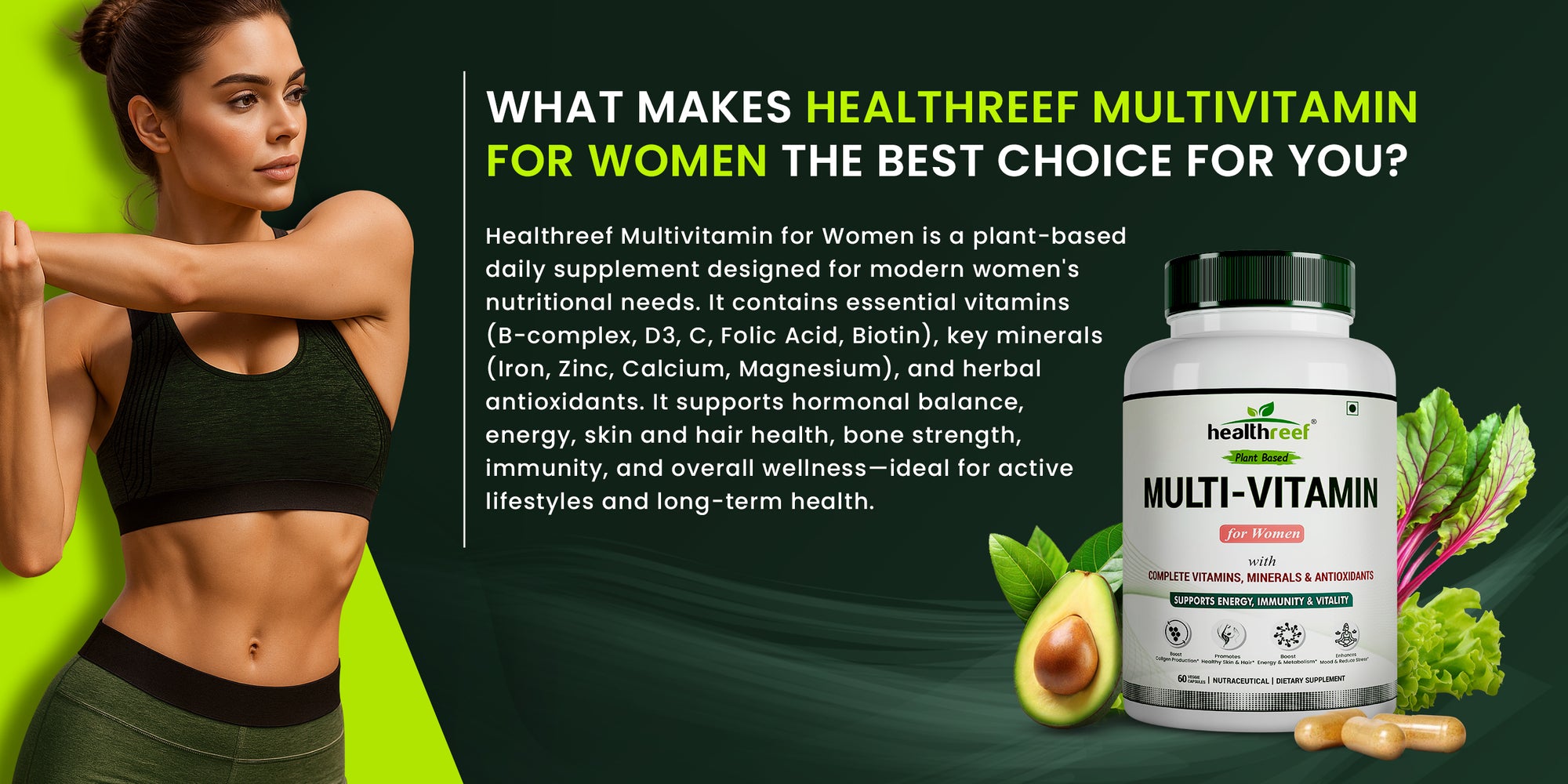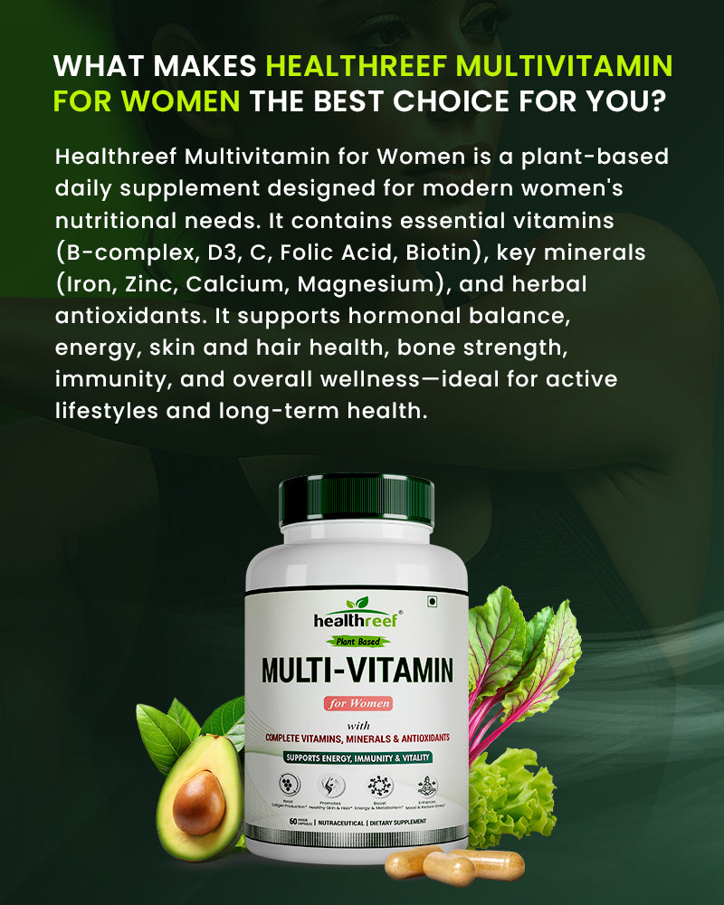 Healthreef Multivitamin for Women is a carefully crafted, plant-based supplement with essential vitamins, minerals, and antioxidants. Featuring vitamin B-complex, D3, C, Folic Acid, Biotin, Iron, Zinc, and Magnesium, it supports energy metabolism, hormonal balance, immunity, strong bones, and healthy skin and hair. This all-in-one formula is ideal for busy lifestyles, fitness enthusiasts, and women seeking long-term wellness and vitality.
