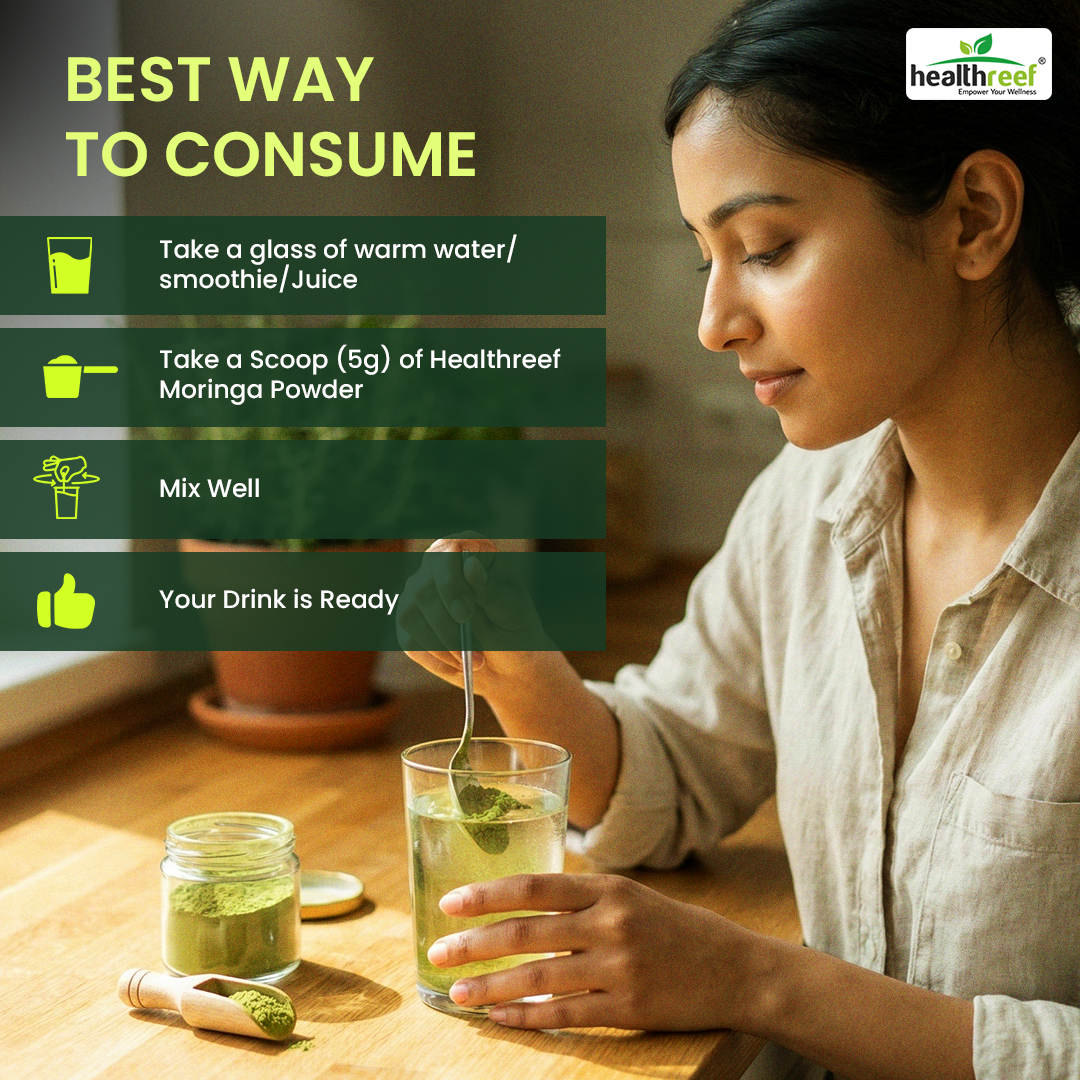 Mix half to one teaspoon of moringa powder into warm water, smoothies, juices, or food as part of your daily routine. It can be taken at any convenient time of the day. Start with a smaller quantity and adjust according to personal preference and taste.