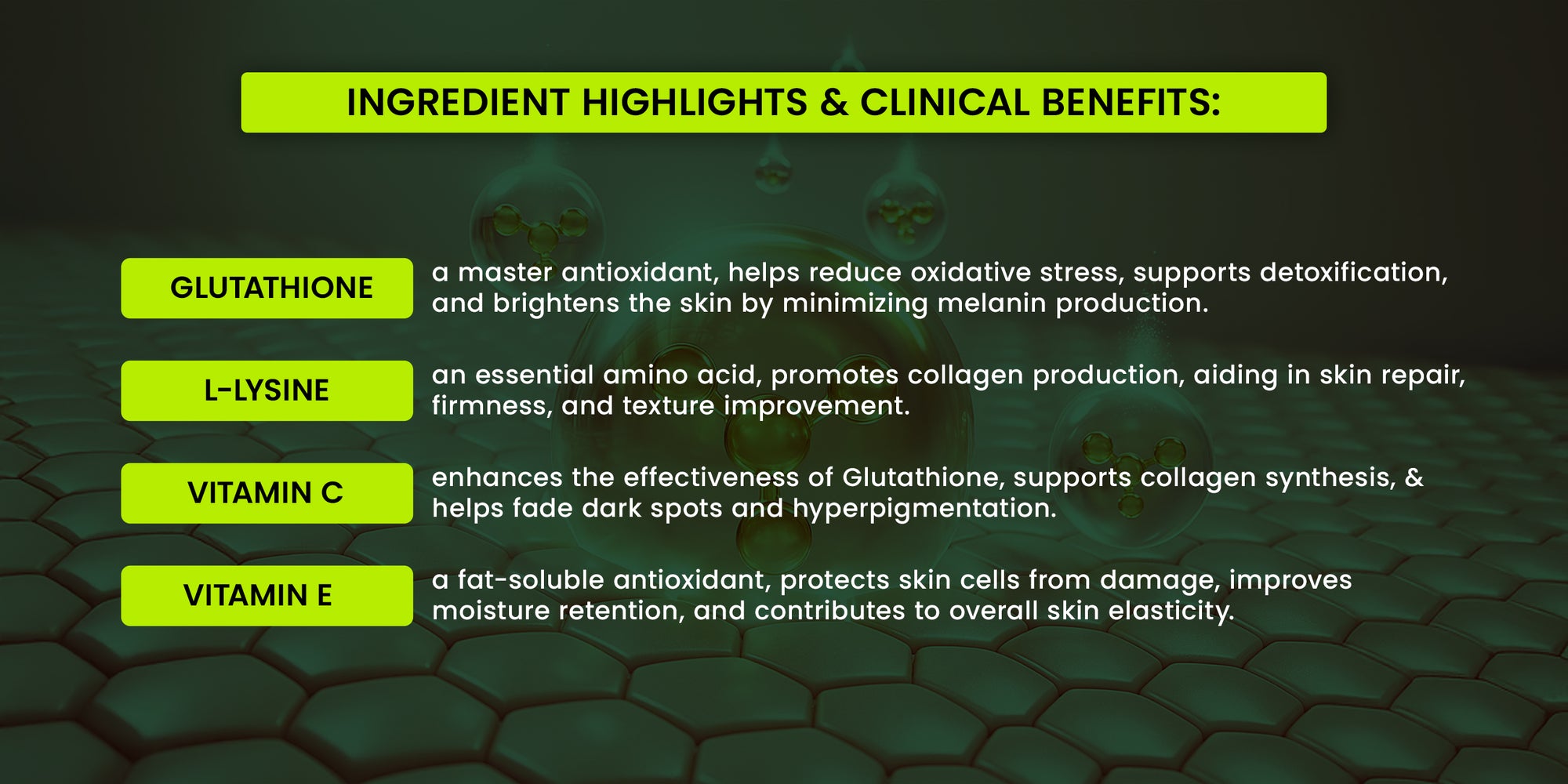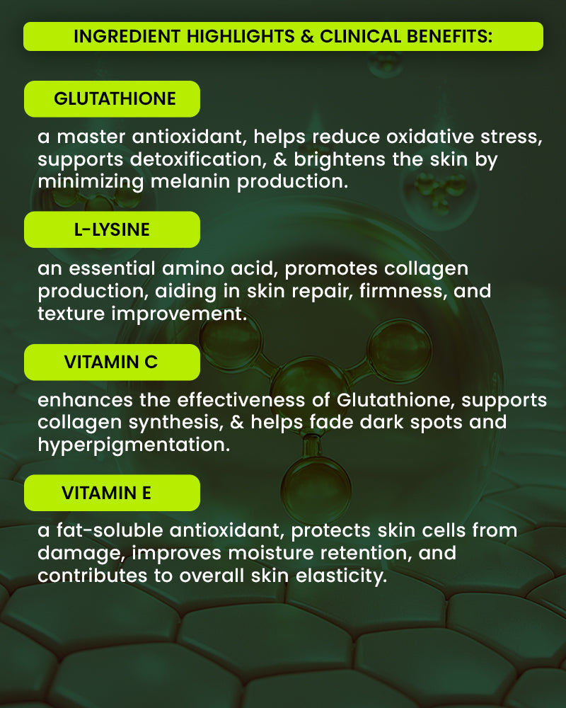 Brighten & Even Skin Tone: L-Glutathione helps fade dark spots, hyperpigmentation, and sun damage for a radiant glow.