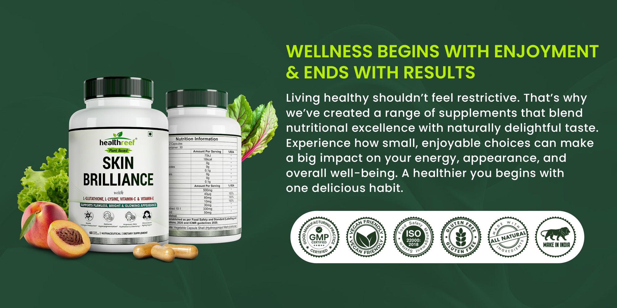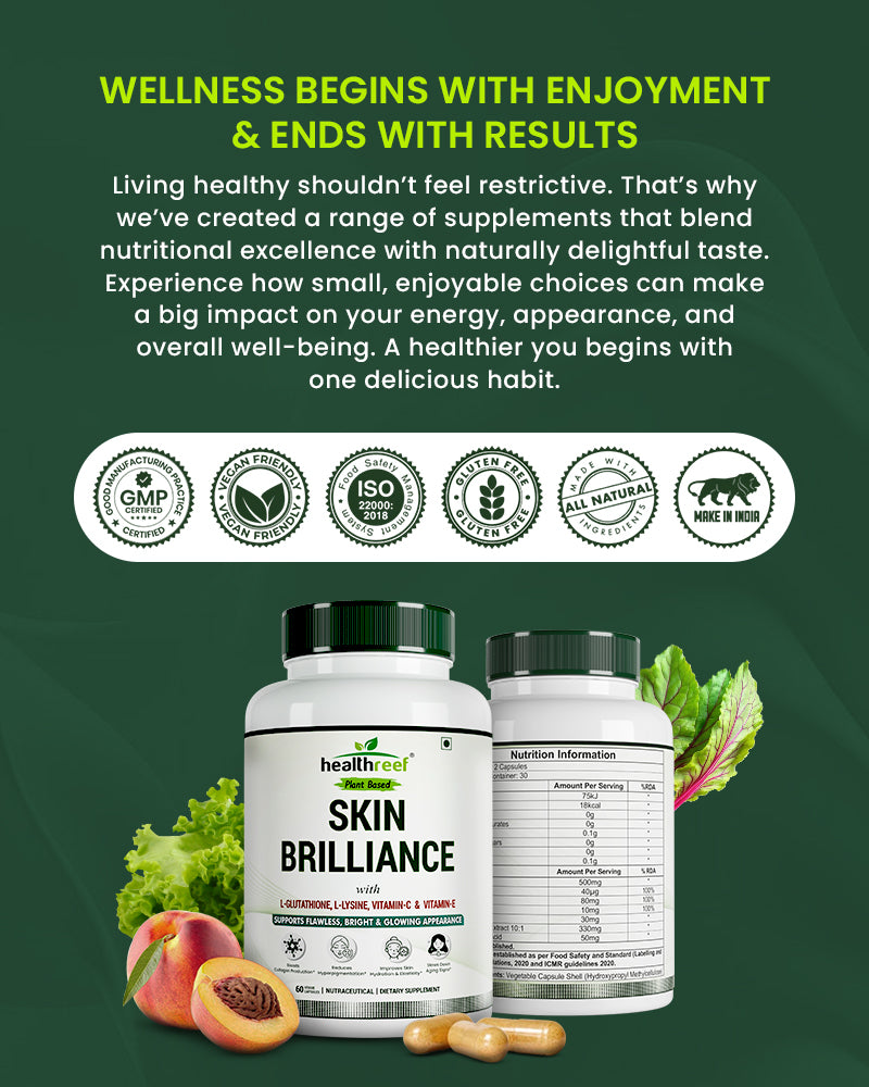 Healthreef Skin Brilliance combines L-Glutathione, L-Lysine, Vitamin C, and Vitamin E to nourish your skin at the cellular level. This potent blend helps reduce signs of aging, promote collagen production, even out skin tone, and enhance your natural radiance—giving you a healthy, luminous glow every day.