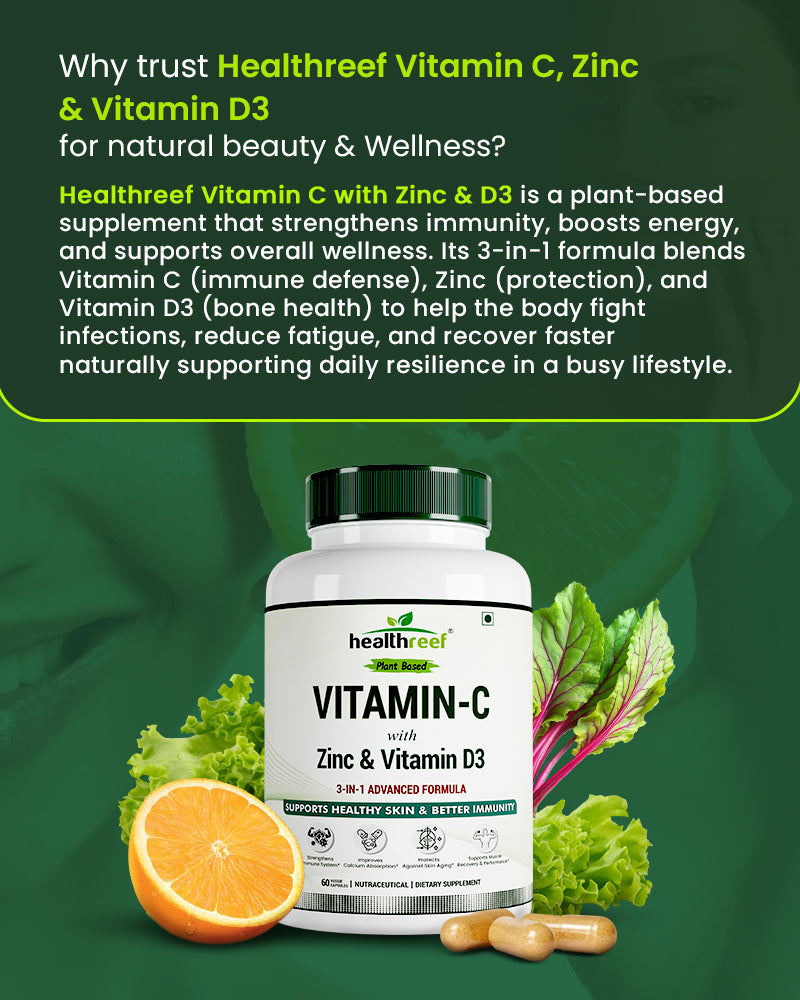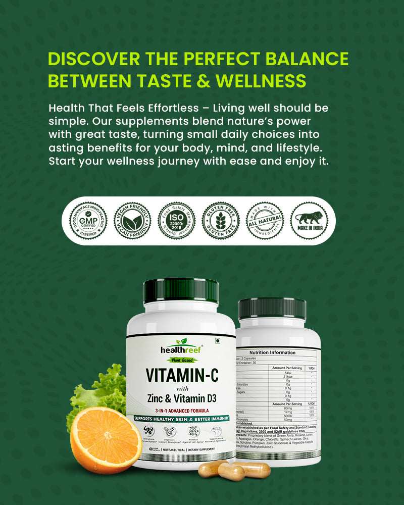 Healthreef Vitamin C with Zinc and Vitamin D3 combines three essential nutrients to strengthen immunity, support bone health, and provide antioxidant protection. This carefully crafted supplement helps maintain overall wellness, enhance natural defenses, and keep your body energized and resilient every day.