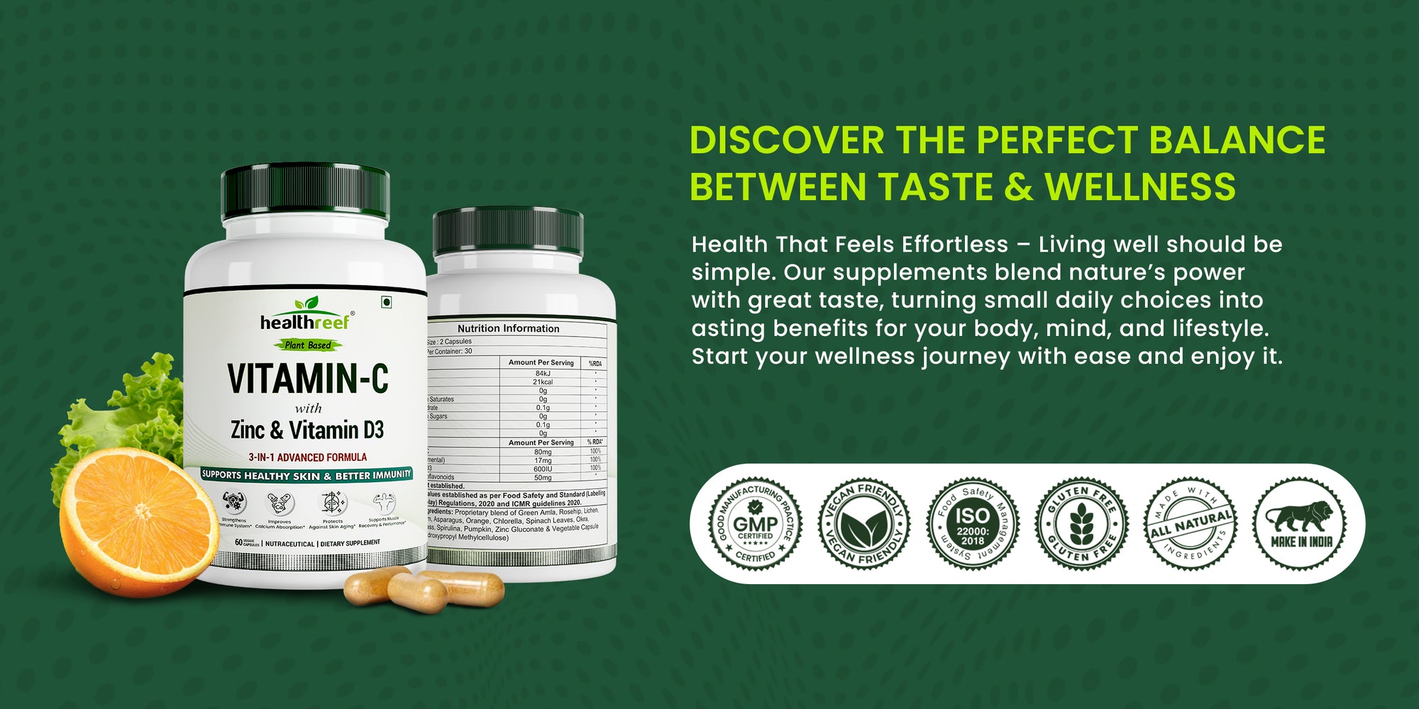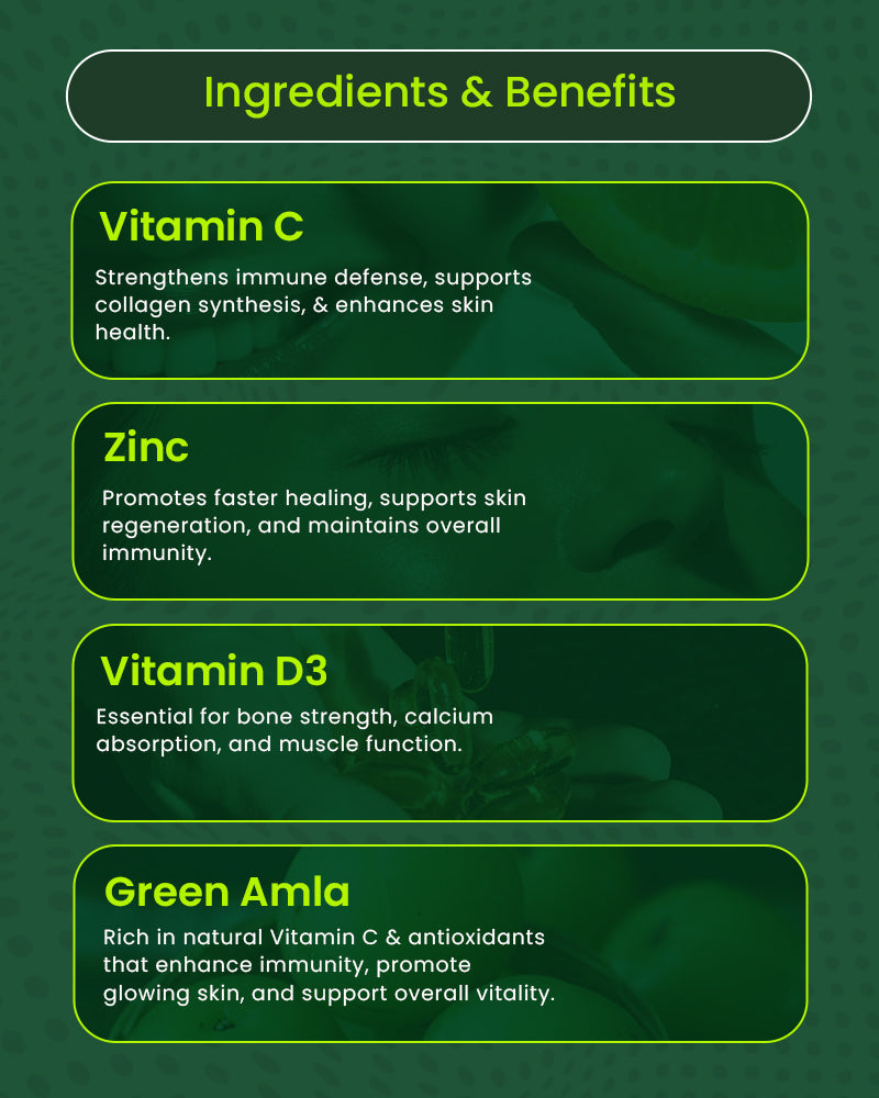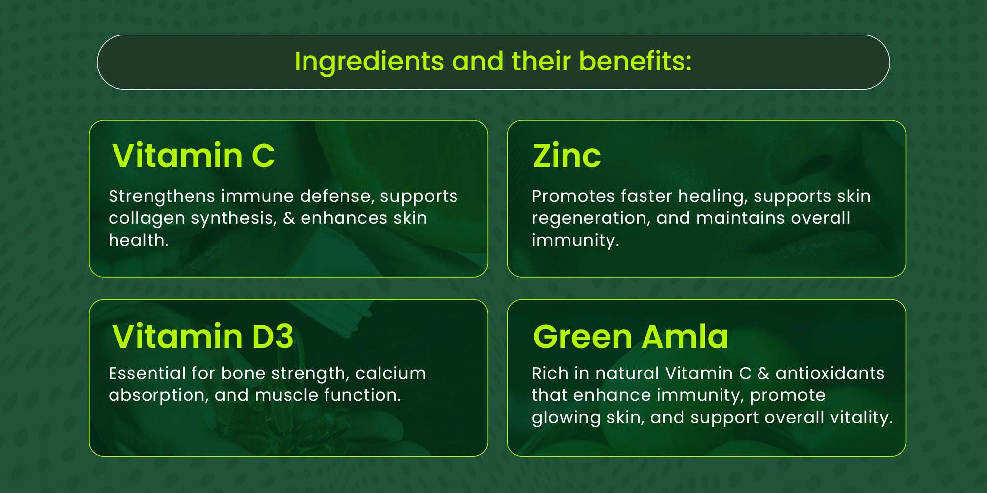 Healthy Skin & Wound Healing: Vitamin C boosts collagen for radiant skin, while Zinc aids tissue repair and skin maintenance.