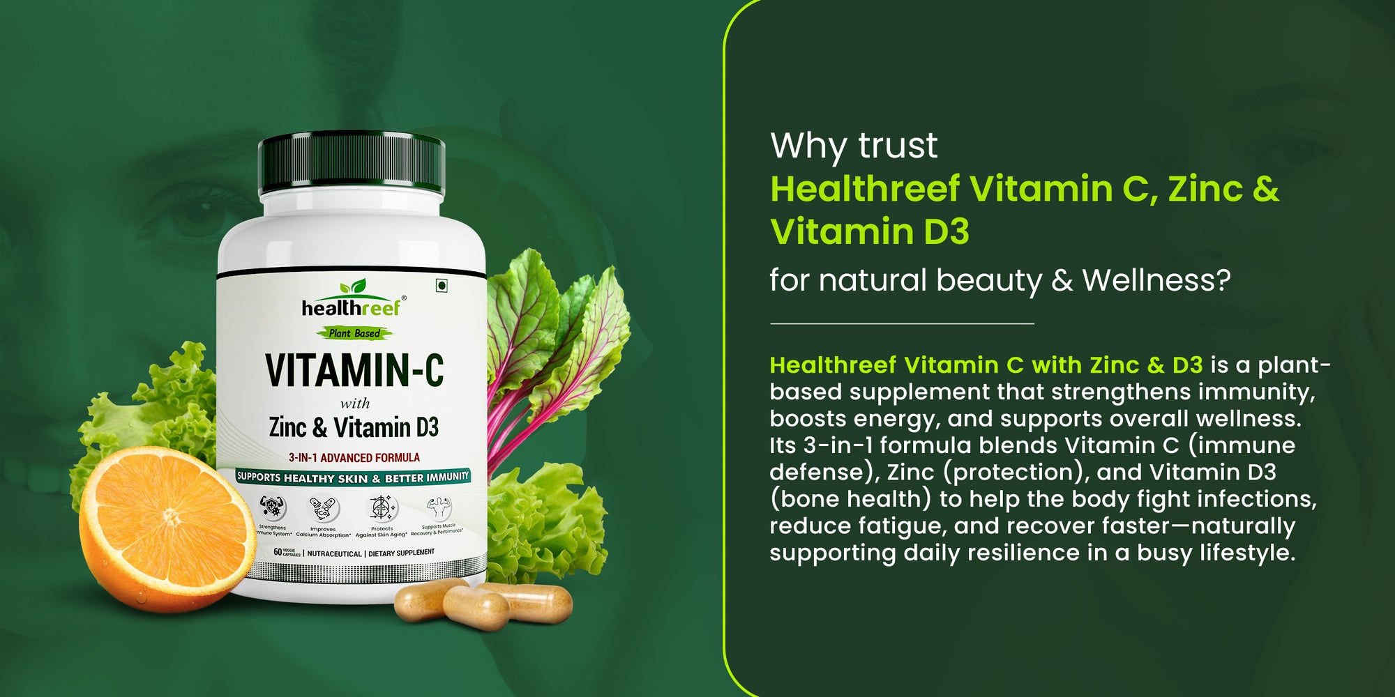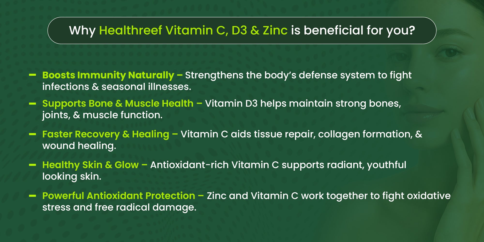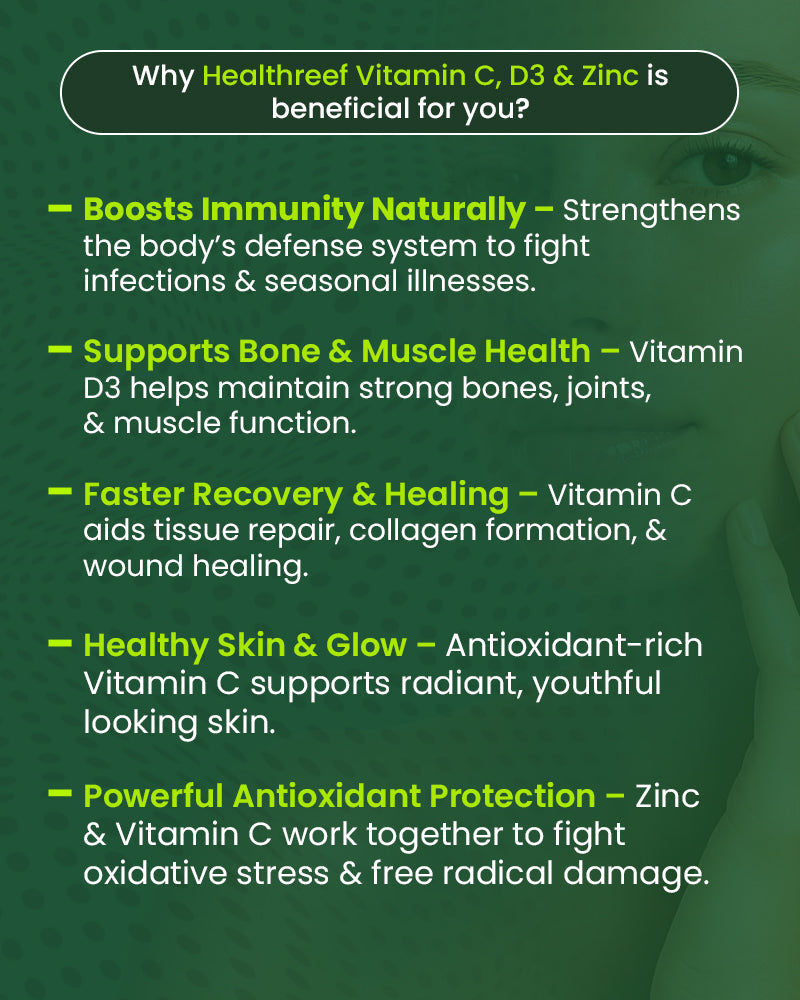Healthy Skin & Wound Healing: Vitamin C boosts collagen for radiant skin, while Zinc aids tissue repair and skin maintenance.